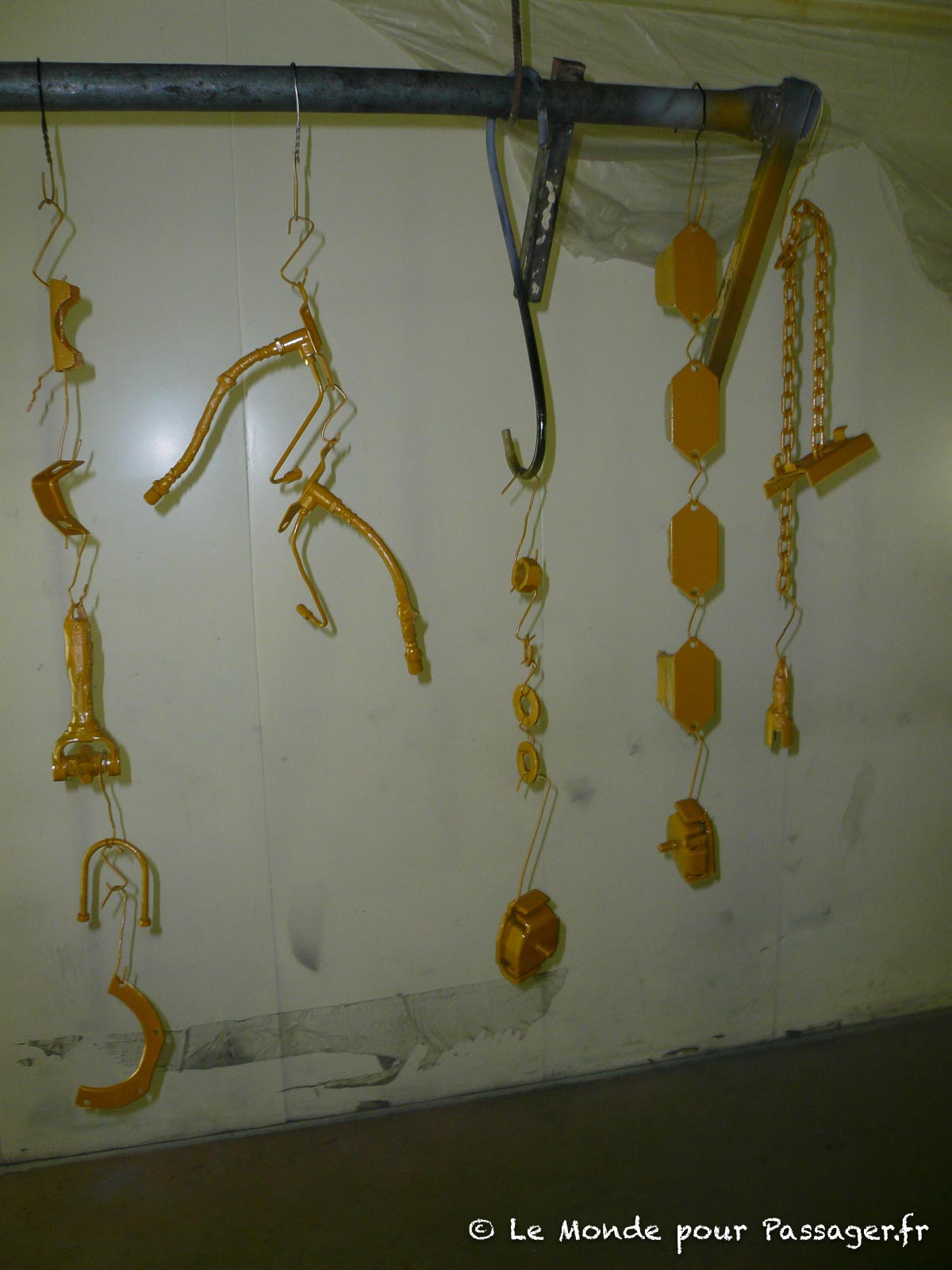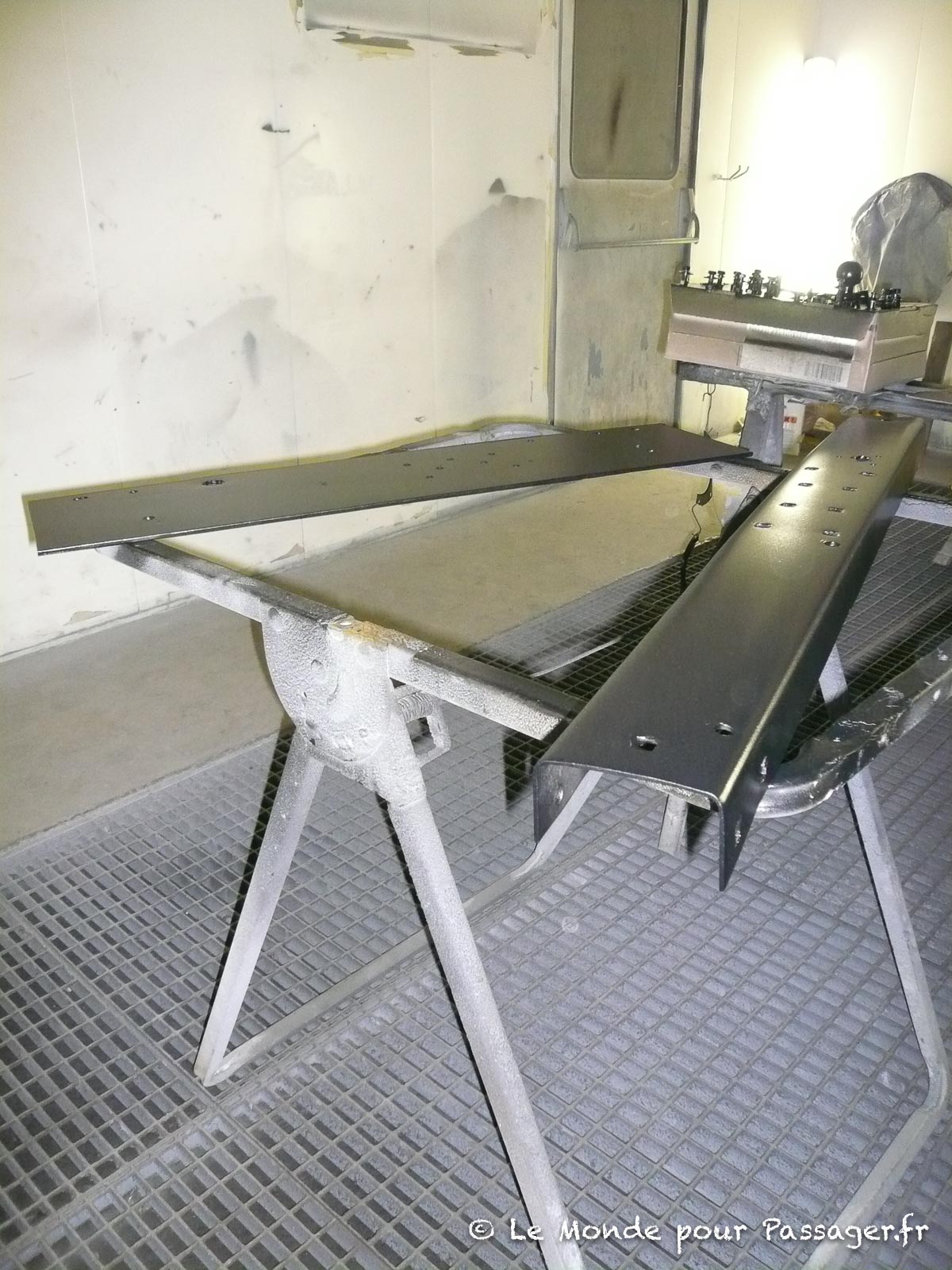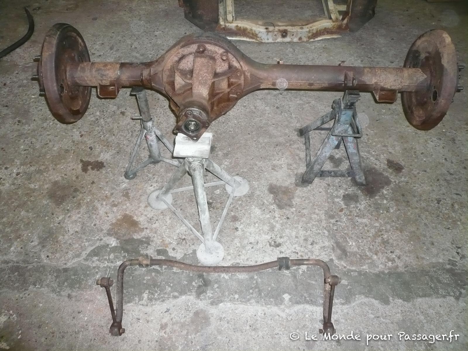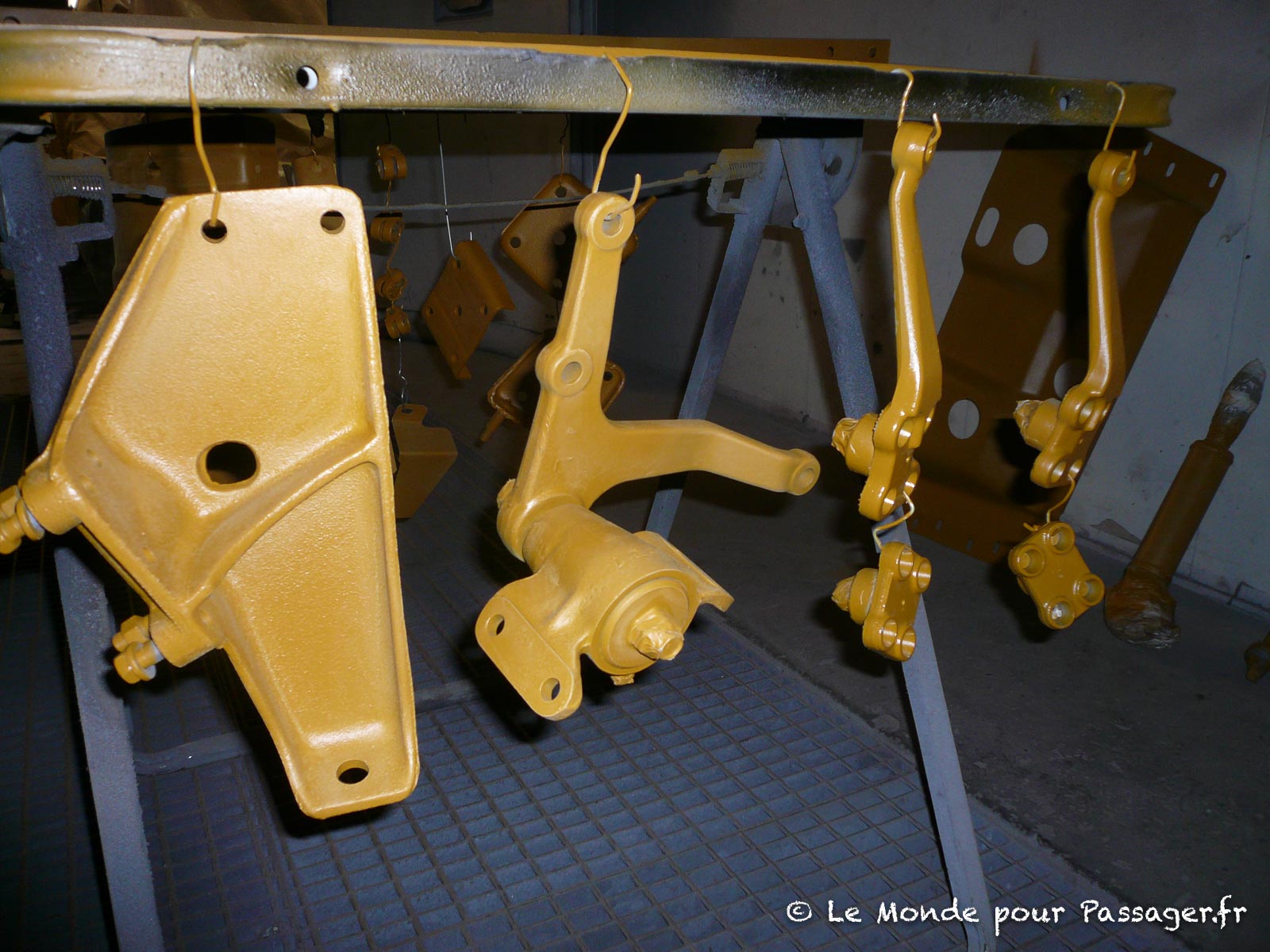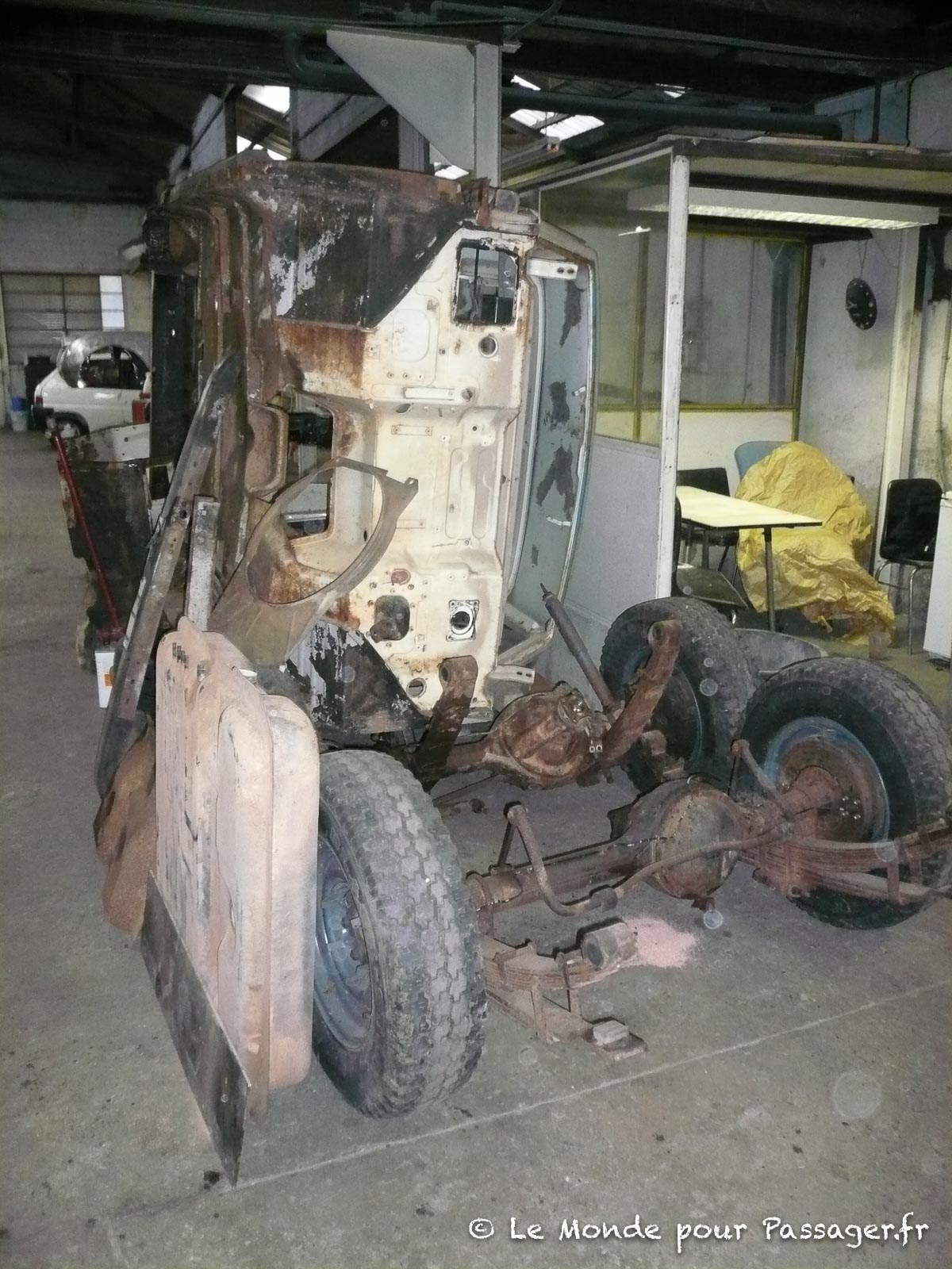 Cette image est intéressante car on découvre les lames renforcées qui ont disparues.Faute de pièces détachées en France, le tube de sortie d’échappement a été remplacé par un tube souple.Le silencieux d’échappement est en piteux état. Il semblerait que celui de BJ42 soit le même.Je n’ose imaginer le travail réalisé pour remettre tout cela en état.Globalement, tout est en bon état malgré les apparences.En 2008, début de la restauration, la voiture est déjà en kit.Pas simple de venir à bout des revêtements anticorrosion de l’époque. Heureusement, sa vie dans le Sahel, puis avec des propriétaires attentionnées font que la caisse semble correcte (en fait non).Toutes les pièces mécaniques sont isolées et vérifiées afin de préparer la commande de restauration.Toutes les pièces sont décapées.Traitement chimique et pistolet thermique servent à enlever l’anti gravillon d’origine de notre FJ55.Les ponts sont intégralement démontés.Le châssis ne présente pas de problème majeur. Un bon sablage et ça devrait aller.Après sablage, les premiers travaux de peinture commencent.La mise en peinture continue. En bas, le pare choc arrière.Après l’antirouille jaune, voici une couche d’apprêt gris.Sablage complet de toutes les pièces avant apprêt antirouille.Le dessous de la caisse est mis « à blanc ».